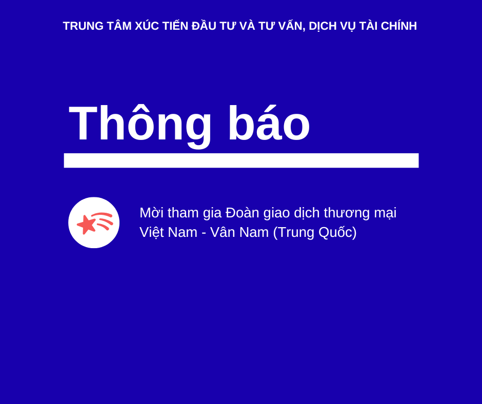 Căn cứ Công văn số 776/XTTM-HTXT ngày 10/3/2026 của Cục Xúc tiến thương mại về việc mời tham dự Đoàn giao dịch thương mại Việt Nam – Vân Nam (Trung Quốc). Trung tâm Xúc tiến đầu tư và Tư vấn, dịch vụ tài chính thông tin tới Quý đơn vị về Đoàn giao dịch thương mại, cụ thể như sau: